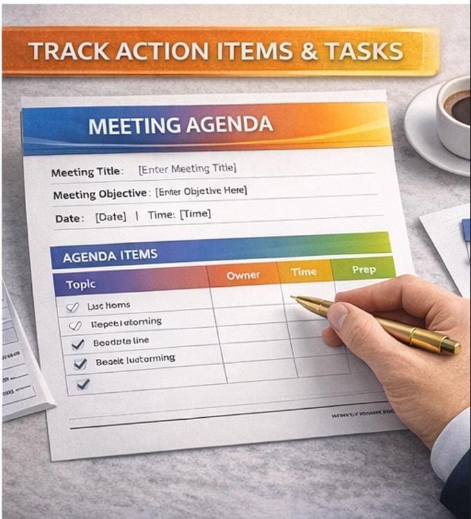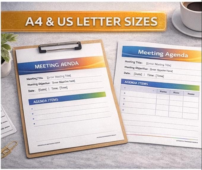 Designed with a modern, colorful, and highly organized layout, this template helps you structure every meeting with clarity. It makes it easy to outline the meeting objective, list attendees, organize agenda items, assign discussion owners, manage timing, record outcomes, and track follow-up actions. Whether you are preparing for internal team meetings, client calls, board meetings, project check-ins, or strategy sessions, this template helps you present everything in a professional and easy-to-read format. ✨