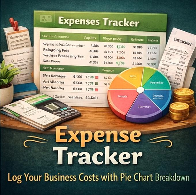 💳 Expense Tracker - Log all business expenses with categories, payment methods, receipt tracking, and tax-deductible flags. A beautiful pie chart breaks down your spending by category (Supplies, Packaging, Advertising, Software, Equipment, and more). Categories are fully customizable from the Settings sheet.