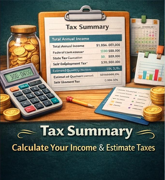 🏛️ Tax Summary - Stop dreading tax season. This sheet gives you a complete annual income summary, estimated Federal, State, and Self-Employment tax calculations, quarterly payment tracking, and a remaining liability calculator - all aligned with Schedule C categories for easy filing. Includes a tax breakdown pie chart.