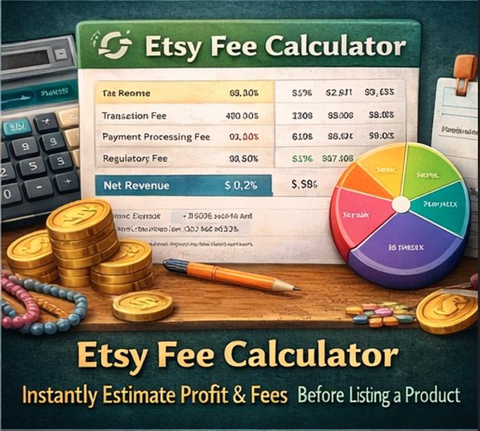 🧮 Fee Calculator - Thinking about listing a new product? Enter any price and instantly see every Etsy fee broken down - Listing Fee, Transaction Fee, Payment Processing, Regulatory Fee, and even Offsite Ads. See your exact Net Profit and Margin before you ever hit publish. A pie chart visualizes the fee split so you know exactly where your money goes.