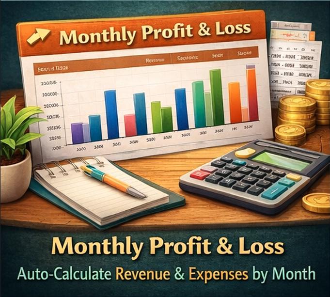 📈 Monthly Profit & Loss Statement - A fully automated 12-month income statement showing Revenue, Cost of Goods Sold, Gross Profit, Operating Expenses, and Net Income with annual totals. Professional grouped bar charts compare all three metrics month by month so you can spot trends instantly.