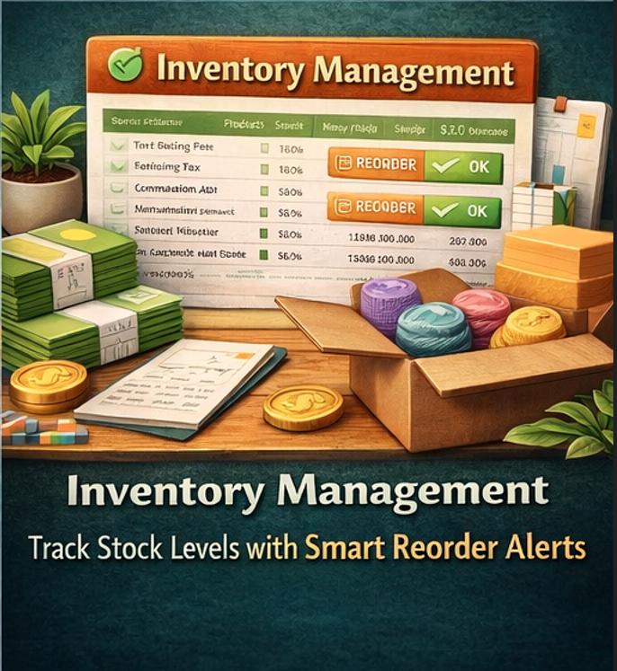 📦 Inventory Management - Track every product's stock level, unit cost, selling price, reorder point, and profit margin. Smart reorder alerts (⚠️ REORDER / ✅ OK) tell you exactly when to restock. Includes a 3D inventory value chart so you always know what your stock is worth.