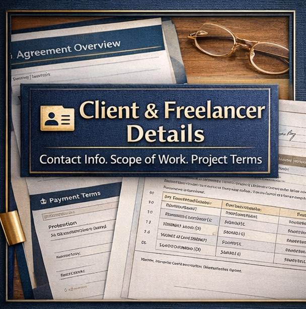 Section 1 - Agreement Overview & Parties Full contact fields for both the Freelancer and Client, including business names, tax IDs, billing contacts, and project reference details.