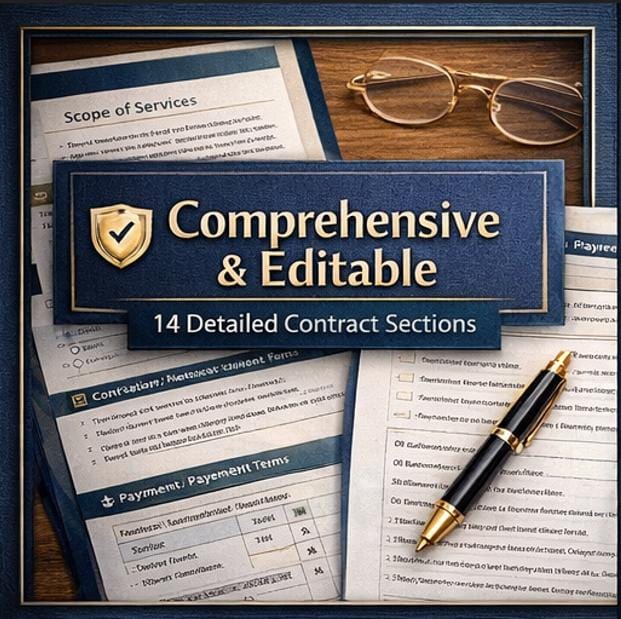 This is not a basic, one-page contract. This is a 14-section, fully comprehensive legal agreement with a beautiful, branded design that impresses clients from the moment they open it.