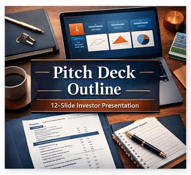 12-Slide Pitch Deck Outline (Sequoia-format): Every slide numbered with a title, detailed guidance, and what investors expect to see: Slides: Cover → Problem → Solution → Market → Product → Business Model → Traction → Competitive Landscape → Marketing & GTM → Team → Financial Projections → The Ask