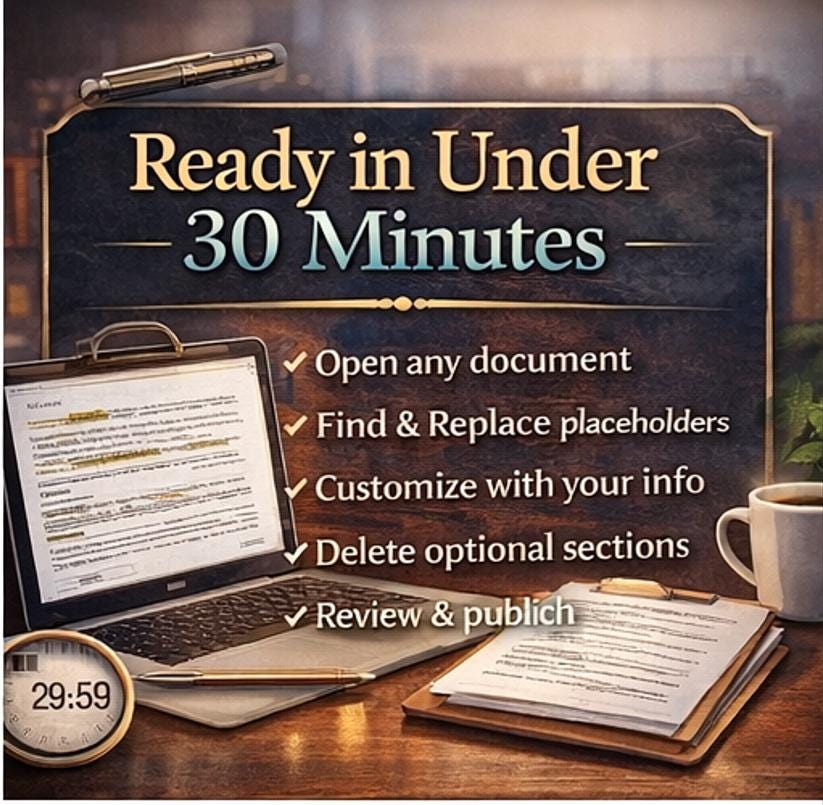 ⚡ Ready in under 30 minutes - Use Find & Replace (Ctrl+H) to swap all your info across every document at once