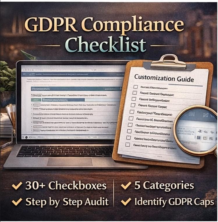 ✅ 05 - GDPR Compliance Checklist 30+ checkboxes across 5 compliance categories - Privacy Policy, Consent Management, Data Subject Rights, Security & Processing, and Records & Accountability. Use it to audit your website before launch or after updates.