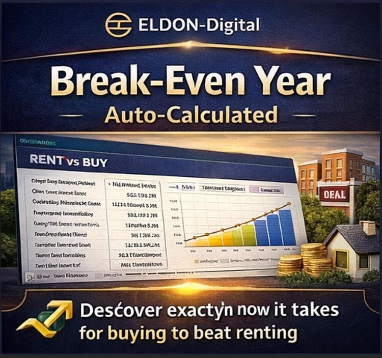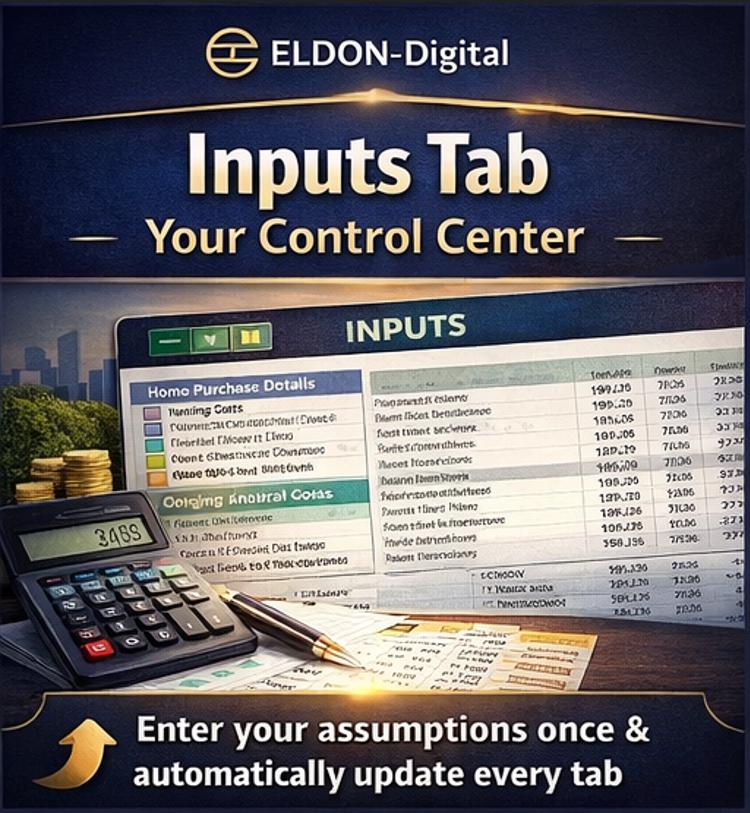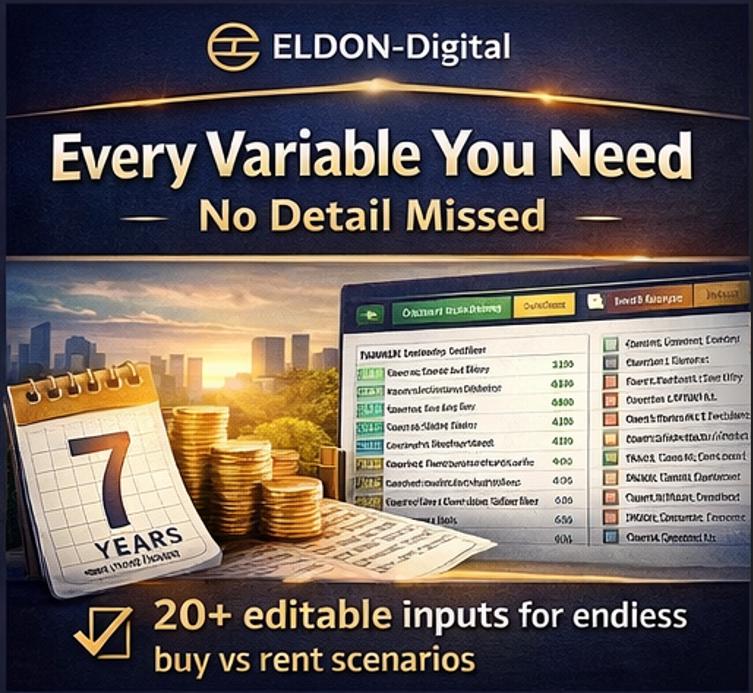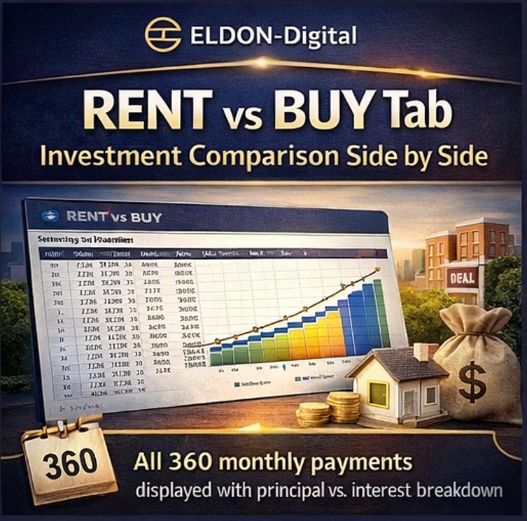 This professional-grade Mortgage & Rent vs. Buy Calculator by ELDON-Digital gives you a complete, crystal-clear picture of your financial future โ in minutes. Just plug in your numbers and watch 30 years of smart financial analysis calculate itself automatically.