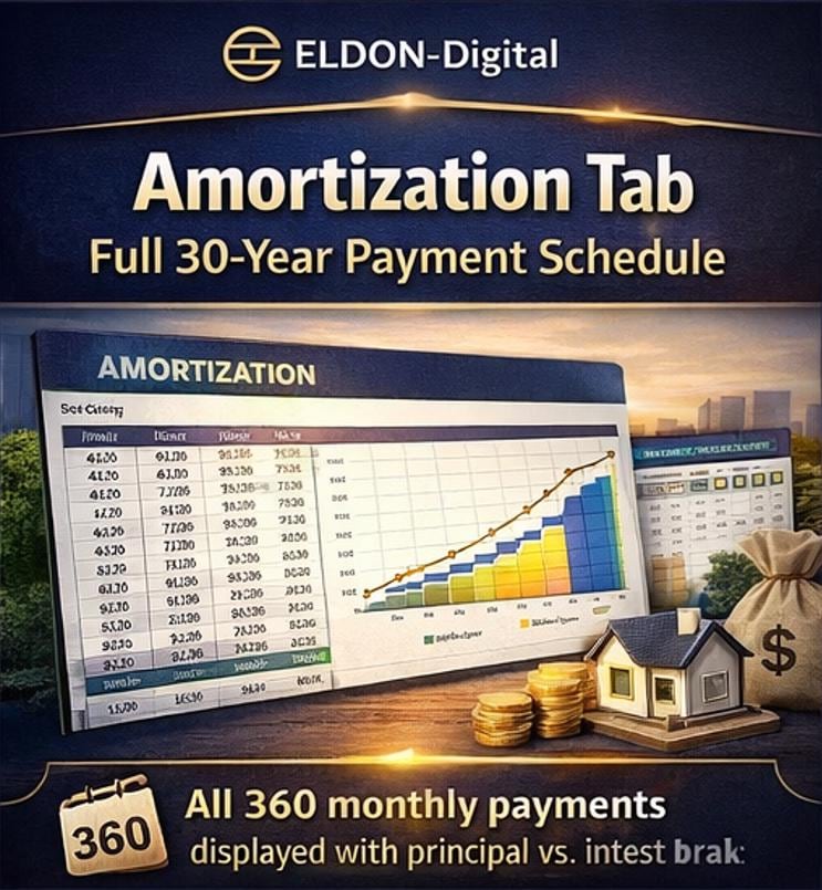 ๐ AMORTIZATION TAB โ Full 30-Year Payment Schedule All 360 monthly payments laid out row by row. See exactly how much of every single payment goes to principal vs. interest โ and watch your equity build month by month. Year-end rows are automatically highlighted for easy reading. Includes cumulative interest and cumulative principal columns so you always know the true cost of your loan.
