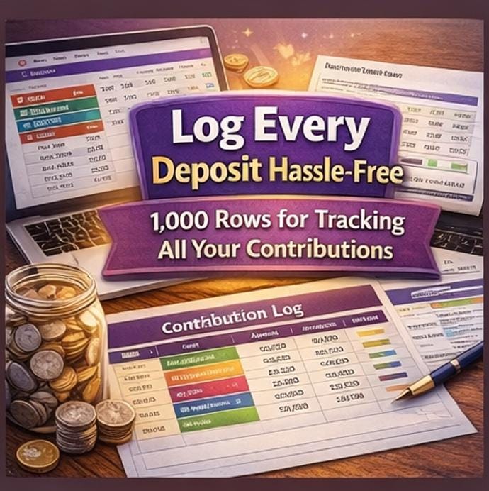 ๐ต Contribution Log -Your savings journal. Every time you move money toward a goal -whether it's a weekly transfer, a birthday check from grandma, or a side hustle payout -log it here. Select the goal from a dropdown, enter the amount and payment method, and the sheet instantly calculates a running total for that specific goal and a cumulative total across all goals. With 1,000 rows, this log has room for years of consistent saving.