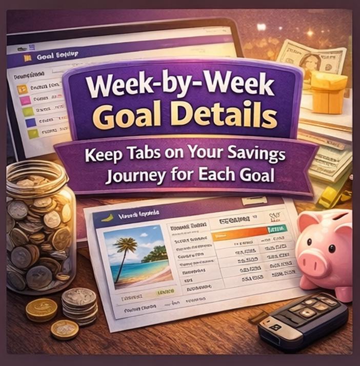 ๐ฉท Goal Details -A personal report card for every dream. Ten individual cards, each showing 12 detailed statistics: goal name, target amount, starting balance, total saved, percentage complete, amount remaining, target date, days left, weekly deposit needed, number of contributions, average contribution size, and priority level. When you want to zoom in on one specific goal, this is where you go.