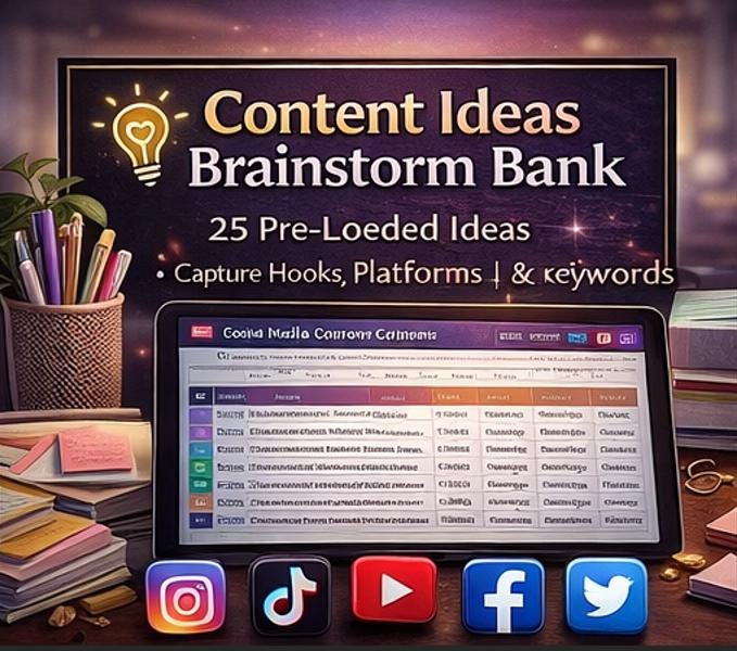 π― Tab 9 -Content Ideas Brainstorm Bank The antidote to creative block. A structured brainstorm bank where you capture every content idea the moment it comes to you. Each idea row has fields for the idea title, content pillar, platform(s), a full description and hook, format type, priority rating (βββ color-coded), and status notes. 20 fully developed, professional-quality content ideas are pre-loaded across all 6 content pillars -from viral TikTok POV concepts to LinkedIn thought leadership threads to Instagram giveaway campaigns -giving you a running head start. 30 blank rows are ready for your own ideas. A live summary at the bottom automatically counts how many ideas you have per content pillar so you can see at a glance where your creativity is concentrated. π‘