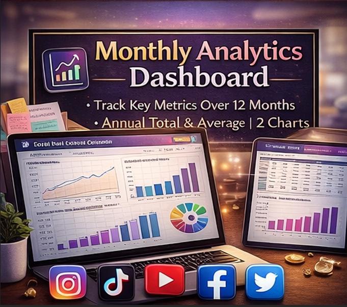 π Tab 8 -Monthly Analytics Dashboard The 12-month performance overview tab that serious creators and business owners need. Pre-loaded with a full year of sample benchmark data across 5 platform sections -Overall Performance, Instagram, TikTok, YouTube, and LinkedIn -plus a Content Mix Performance section showing engagement rates by content pillar. Every metric has an annual total or average in the final column (using the correct formula type -SUM for totals, AVERAGE for rate metrics). Two automatically updating charts visualize your Monthly Total Reach (line chart) and Monthly Follower Growth (bar chart) -both updating live whenever you enter your monthly data. Perfect for reporting to clients, stakeholders, or your own performance reviews. π