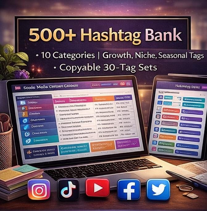 #οΈβ£ Tab 6 -Hashtag Bank (500+ Hashtags Organized & Ready) Never waste time searching for hashtags again. This tab is a comprehensively organized hashtag library with 10 full categories -Branded, Niche/Industry, Reach & Growth (High Volume), Instagram-Specific, TikTok-Specific, LinkedIn-Specific, Pinterest-Specific, Educational, Engagement Boosters, and Seasonal/Trending -each pre-loaded with high-performing hashtag examples. Every hashtag row includes a platform column, a performance rating column, an average reach field to track what works, and a notes field. At the bottom you'll find 4 ready-to-copy quick-use hashtag sets -a 30-tag growth set, an Instagram Reels set, a LinkedIn professional set, and a TikTok viral set -that you can copy directly into your captions with one click. #οΈβ£