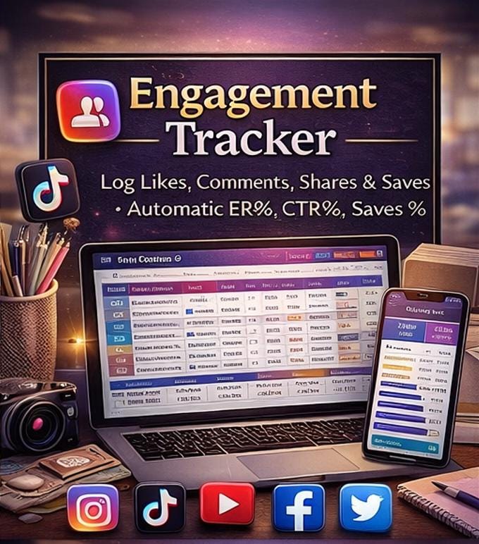 π Tab 7 -Engagement Tracker After your posts go live, this is where you record what happened. A powerful 17-column post-by-post performance tracker where you log your likes, comments, shares/retweets, saves, link clicks, reach, and impressions for every single post. The template then automatically calculates your Engagement Rate %, Click-Through Rate %, and Save Rate % using professionally guarded formulas that never produce errors even on empty rows. A color-coded performance rating column lets you quickly tag each post as a 1β5 star performer. At the bottom, a full summary section instantly calculates your total posts, total likes, total comments, total shares, total saves, total reach, average engagement rate, average CTR, and automatically identifies your best-performing post by reach -all updating live as you add data. π