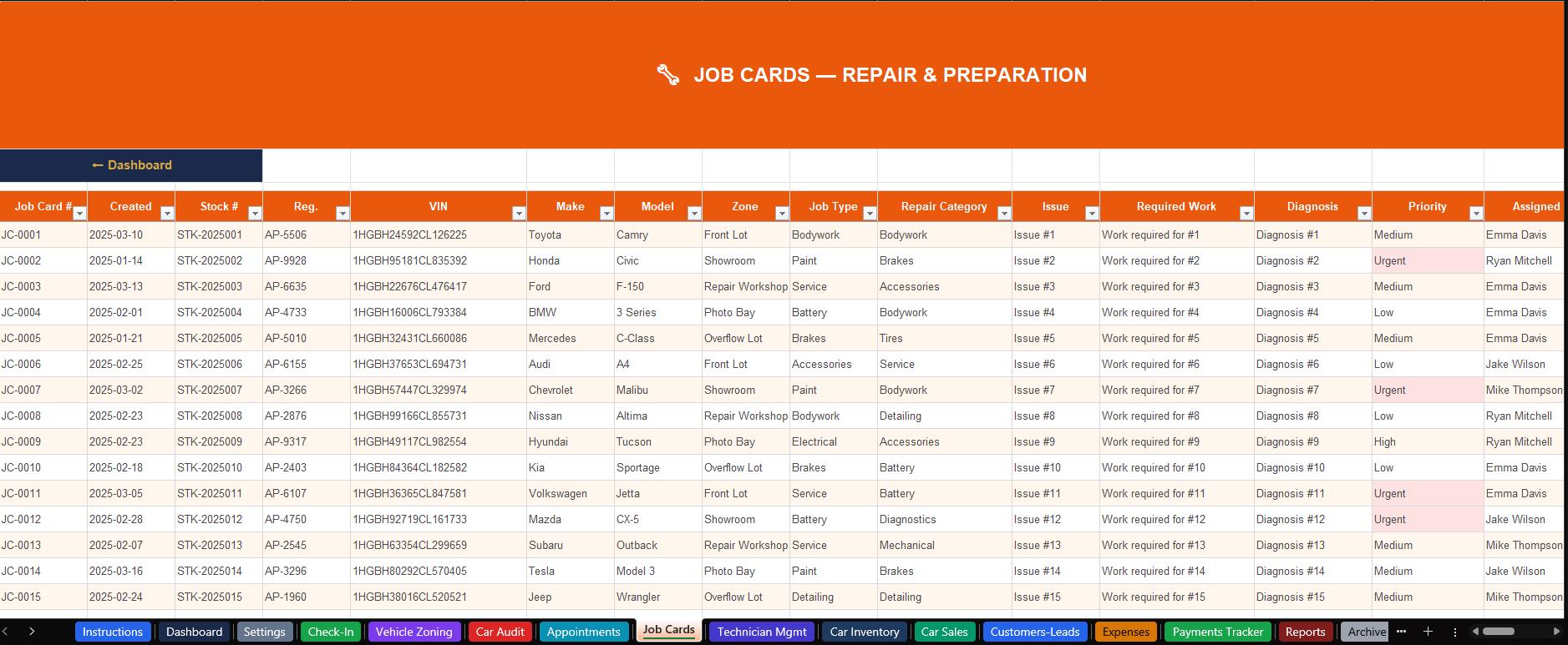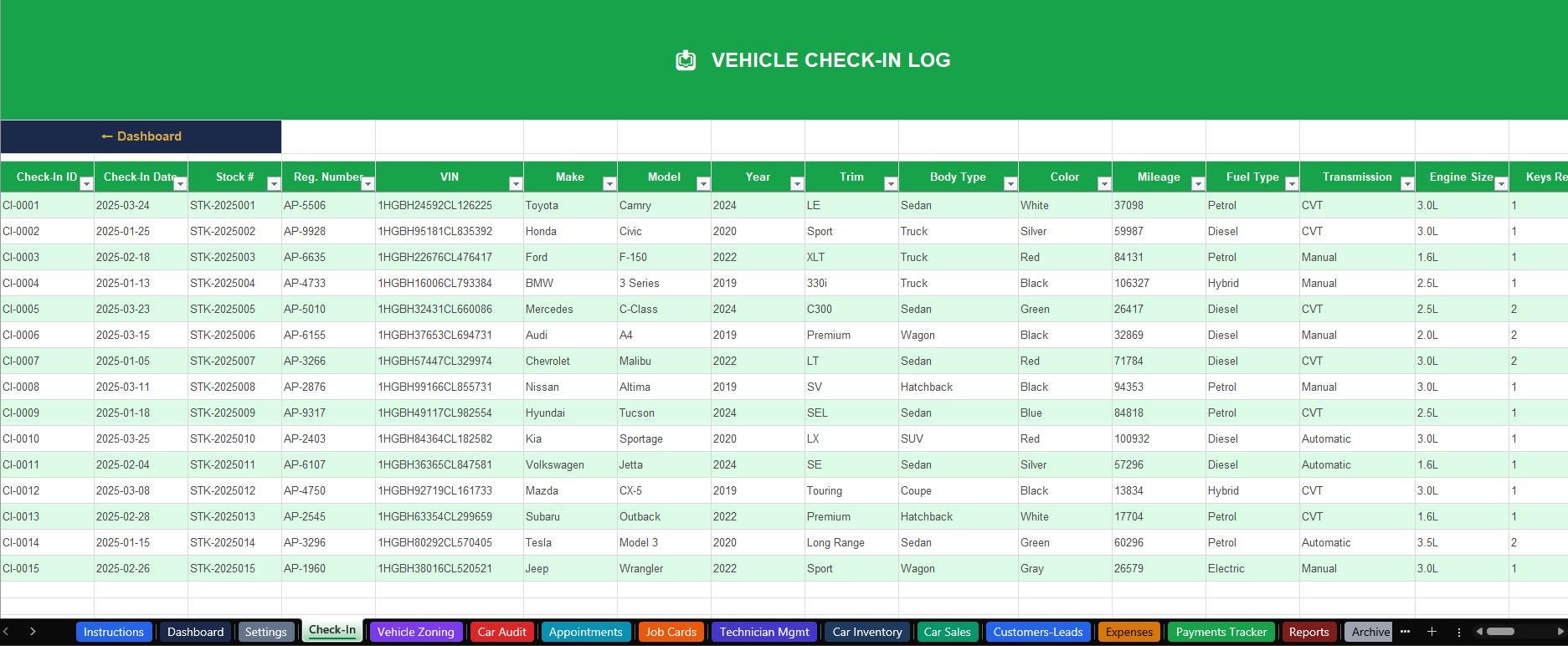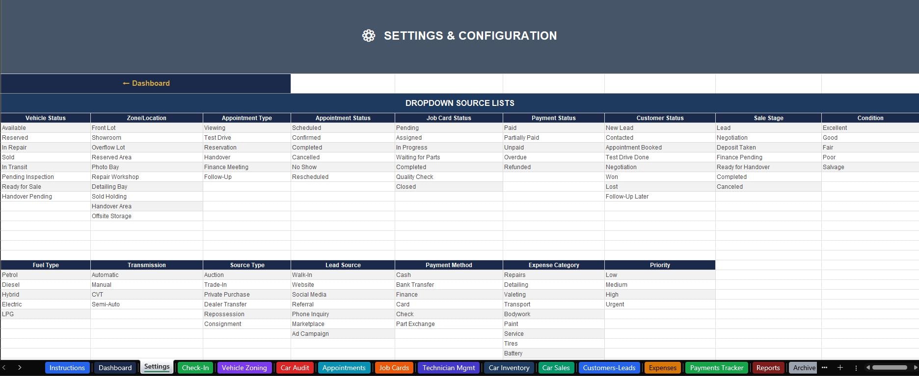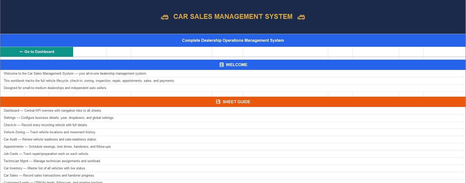 1๏ธโฃ Download the file and open it in Excel or upload to Google Sheets 2๏ธโฃ Go to the Settings sheet and enter your dealership details and reporting year 3๏ธโฃ Start logging vehicles in the Check-In sheet as they arrive 4๏ธโฃ Use Vehicle Zoning, Job Cards, and Appointments to manage daily operations 5๏ธโฃ Record sales and track payments as deals close 6๏ธโฃ Monitor everything from the Dashboard and Reports
