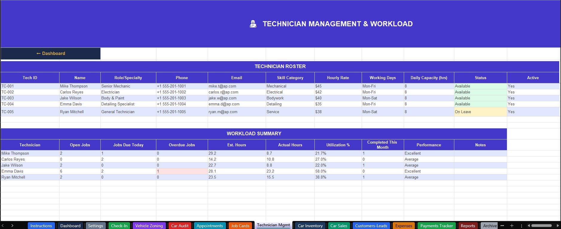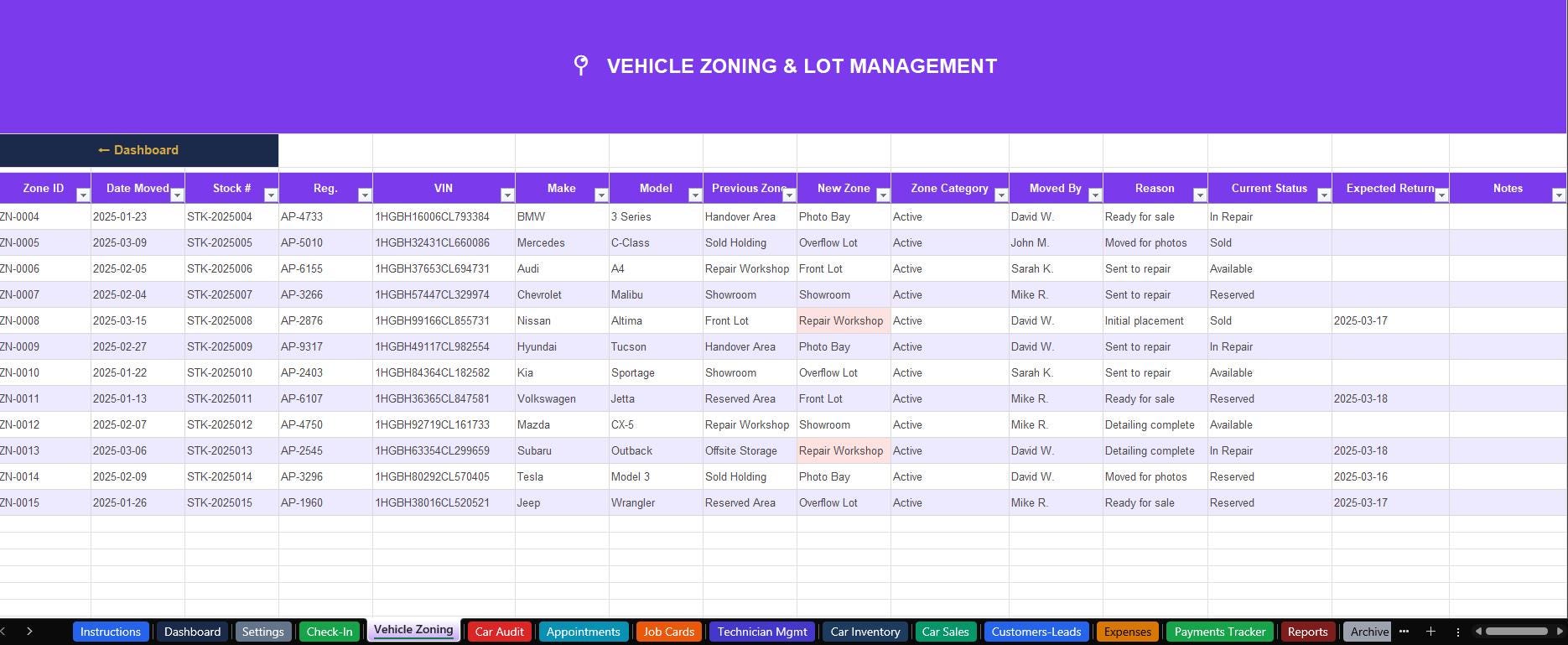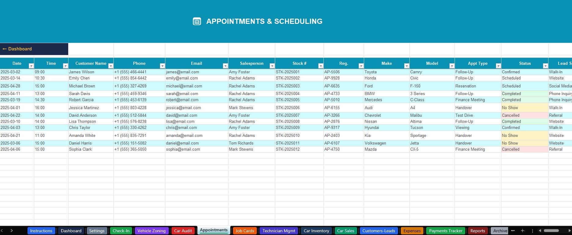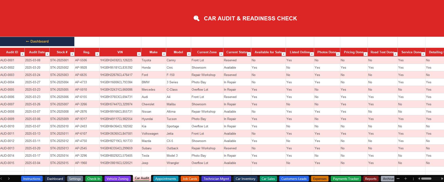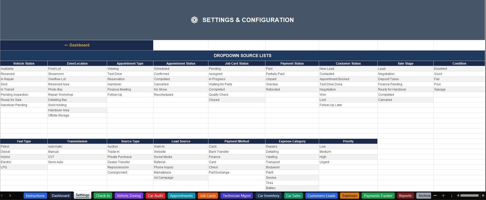 1๏ธโฃ Download the file and open it in Excel or upload to Google Sheets 2๏ธโฃ Go to the Settings sheet and enter your dealership details and reporting year 3๏ธโฃ Start logging vehicles in the Check-In sheet as they arrive 4๏ธโฃ Use Vehicle Zoning, Job Cards, and Appointments to manage daily operations 5๏ธโฃ Record sales and track payments as deals close 6๏ธโฃ Monitor everything from the Dashboard and Reports