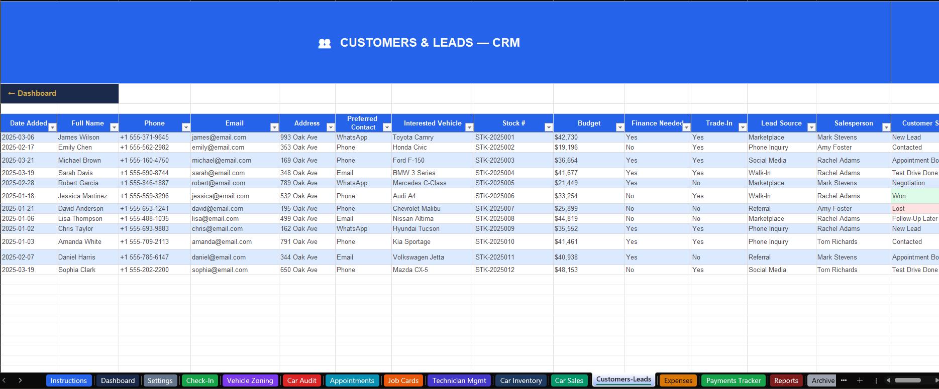 Whether you run a small independent lot or a growing multi-person dealership, this spreadsheet replaces the chaos of scattered notes, paper logs, and forgotten follow-ups with one powerful, organized workbook that tracks every vehicle from the moment it arrives to the moment the keys are handed over.