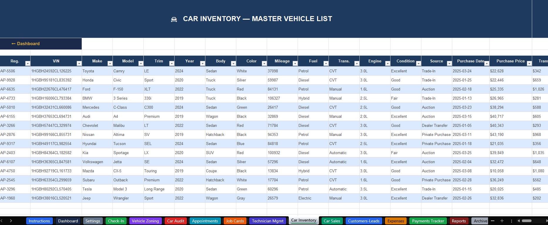 ๐ Car Inventory -The master list. Every vehicle with 33 columns covering specs, costs, pricing, profit margins, status, zone, listing status, reservation, and sale assignment. This is the beating heart of the workbook.