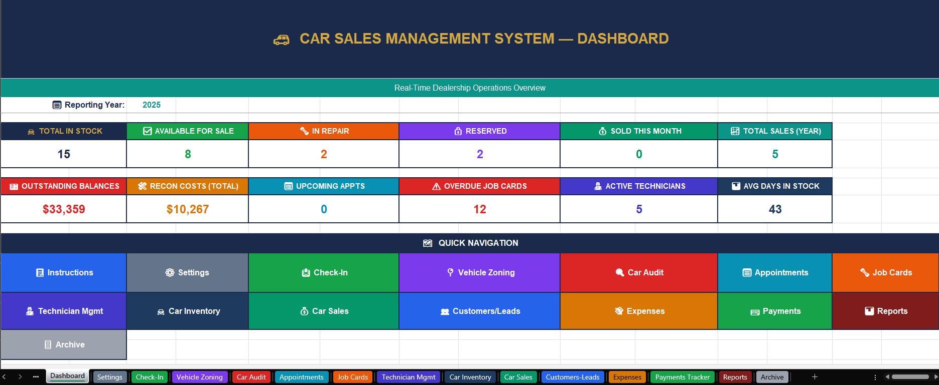 ๐ Dashboard -Your command center. 12 live KPI cards show total stock, vehicles available, units in repair, reserved count, monthly and yearly sales, outstanding customer balances, reconditioning costs, upcoming appointments, overdue job cards, active technicians, and average days in stock. One-click navigation tiles take you to any sheet instantly.