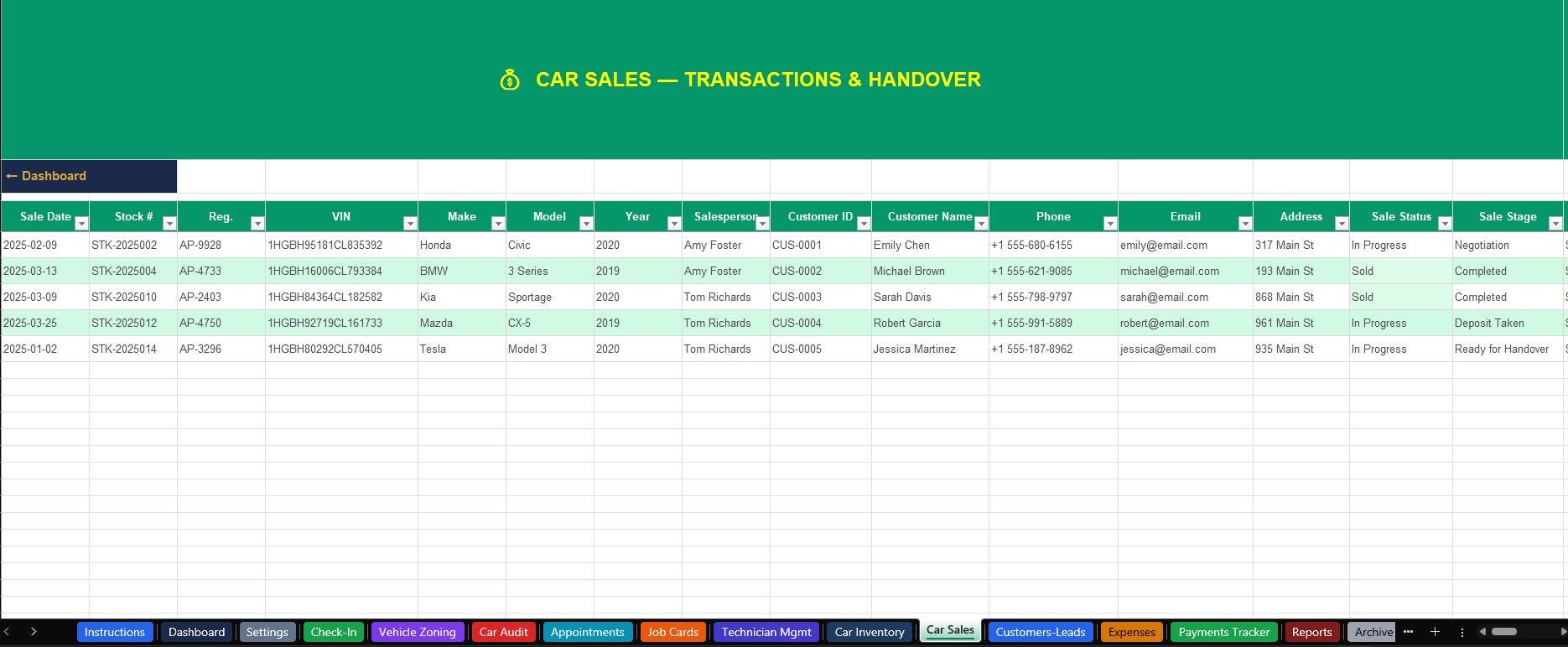Take full control of your car dealership with this beautifully designed, all-in-one management system built in Microsoft Excel and fully compatible with Google Sheets.