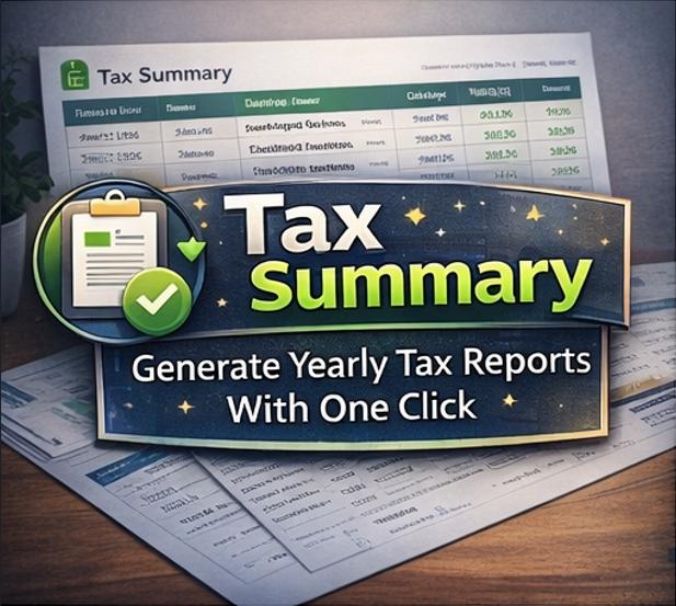 π§Ύ TAX SUMMARY -A complete fiscal year tax report showing gross revenue, total tax collected, effective tax rate, YTD paid invoices, outstanding tax estimates, a full 12-month monthly tax breakdown, and a tax breakdown by service category -all live and automatic.