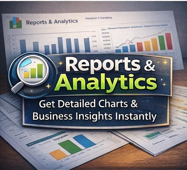 π REPORTS & ANALYTICS -Pre-built business intelligence with a 12-month revenue-by-month table, invoice aging report (5 aging buckets from current to 90+ days overdue), revenue charts, and payment method analysis. Everything recalculates when you change your data.