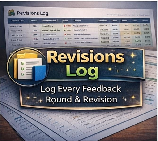 π REVISIONS LOG -Log every feedback round in full detail: Deliverable ID, Client, Revision Number, Date, Reviewer, complete Feedback Summary, Action Required, Status, and Time Spent. Now you have a permanent, searchable record of every change request that was ever made -perfect for scope creep disputes and client communication.