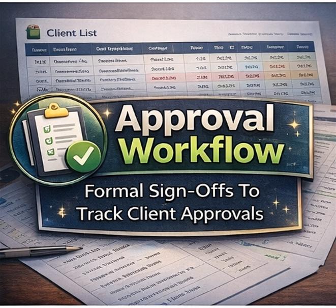 APPROVALS LOG -A formal sign-off record for every approved deliverable. Track approval date, who approved it, the approval method (Email, Video Call, Client Portal, In-Person, Slack), and written notes. Includes a monthly approval trend line chart showing your delivery velocity.