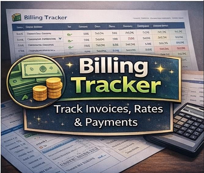 Q: Can I change the billing rate for different clients? A: Yes. Each billing row in the BILLING sheet has its own Rate column, so you can enter different rates per deliverable or per client. The Amount column (Hours Γ Rate) recalculates automatically for each row.