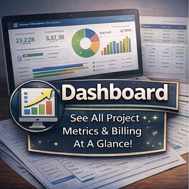 π DASHBOARD -Your mission control. See every critical metric at a glance across 8 live KPI cards: Total Deliverables, Approved Count, In Review Count, Overdue Count, Total Billed, Revenue Collected, Estimated Hours, and Overall Approval Rate -all updating the instant you enter or change data. Plus: a live recent deliverables table, a billing summary panel, a full 12-month billing trend chart, and a deliverable status pie chart.