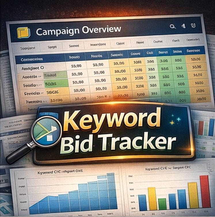 Q: Does it work for multiple campaigns? A: Yes. The data tables support up to 100 campaigns in Campaign Overview and up to 200 keywords in the Keyword Bid Tracker, with room to expand further.