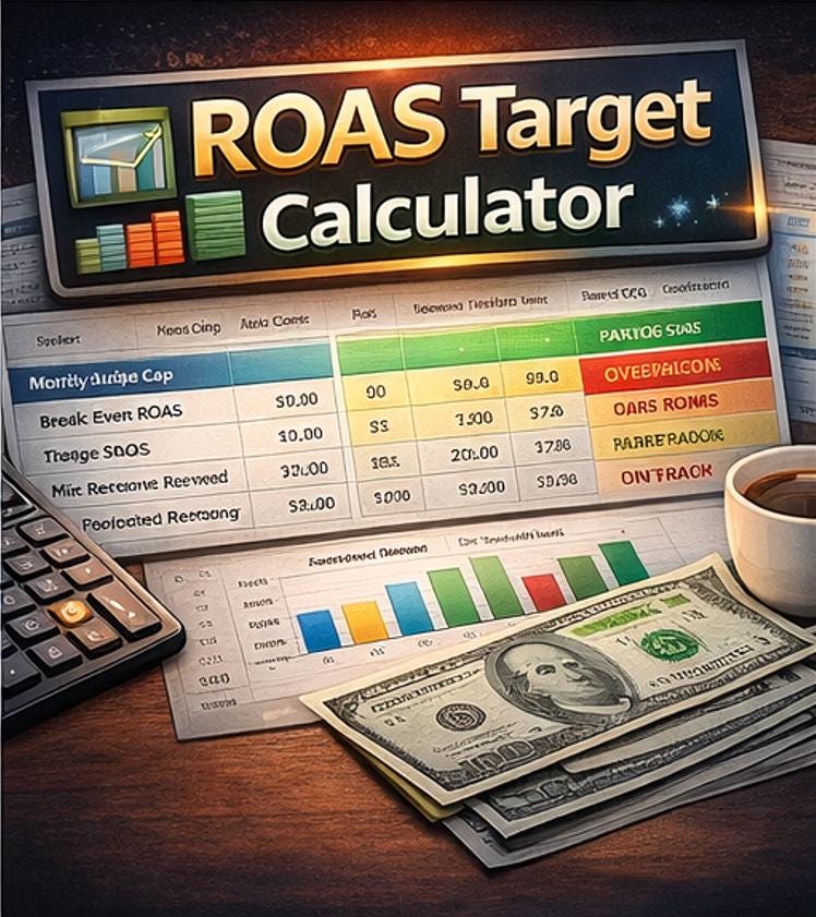 12. π ROAS Target Calculator Enter your Average Order Value, COGS, and target profit margin -and the calculator instantly outputs your Break-Even ROAS, Target ROAS for your profit goal, minimum revenue needed per $1 spent, projected monthly revenue, and actual profit at your current ROAS. Includes a Scenario Planner table showing revenue outcomes at 9 different spend levels and an embedded ROAS Scenario Bar Chart.