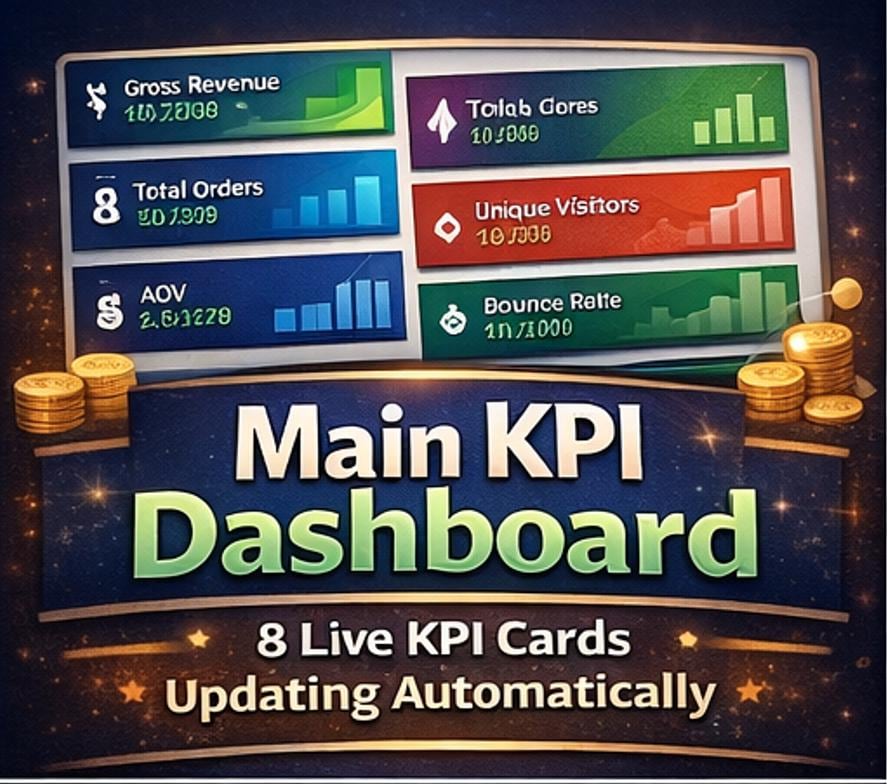 π Main Dashboard Your central command hub. Eight live KPI cards display Gross Revenue, Total Orders, Conversion Rate, AOV, Unique Visitors, Bounce Rate, Avg Session Duration, and Net Revenue -all updating automatically. One-click buttons navigate to every section instantly.