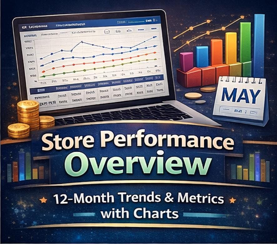 π Store Performance Overview Track 12 months of Sessions, Unique Visitors, Bounce Rate, Pages per Session, Average Session Duration, Total Orders, Conversion Rate, AOV, Gross Revenue, Refunds, and Net Revenue -with automatic totals and month-over-month trend charts.