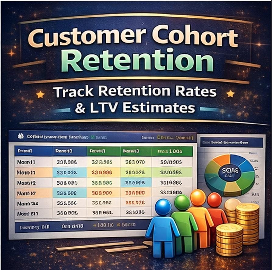 π₯ Customer Cohort Retention Track Month-1, Month-3, Month-6, and Month-12 retention rates for each customer acquisition cohort. LTV estimates auto-calculate. Color-scale conditional formatting highlights your strongest and weakest cohorts at a glance.