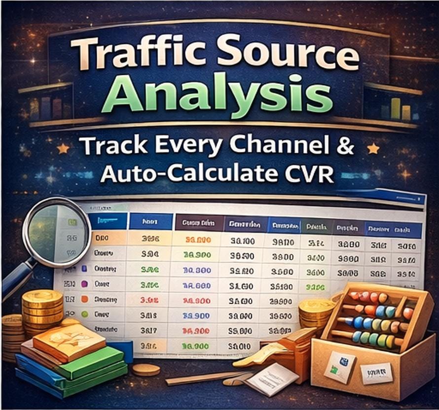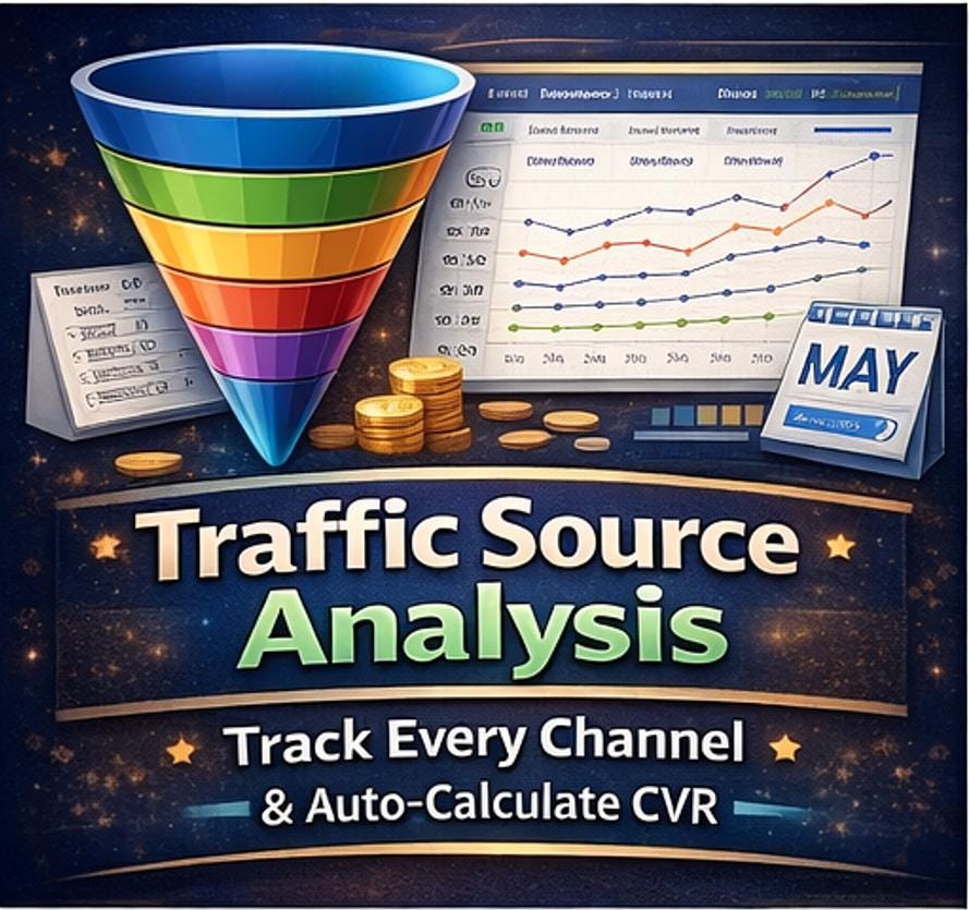 π¦ Traffic Source Analysis Break down every session and conversion by channel -Direct, Organic Search, Paid Search, Social Media, Email Marketing, Referral, and SMS. CVR auto-calculates per channel. Annual totals and a Sessions-by-Channel pie chart update live.