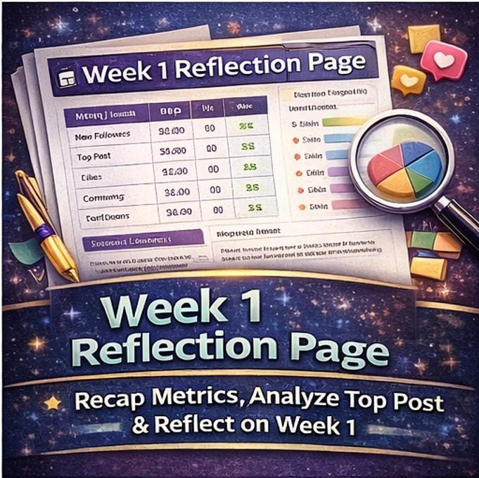 π Week 1 Reflection Page -End your first week strong with a full metrics snapshot table, top post analysis, easy/difficult recaps, your biggest lesson learned, and a deep reflection prompt to sharpen your strategy for Week 2.