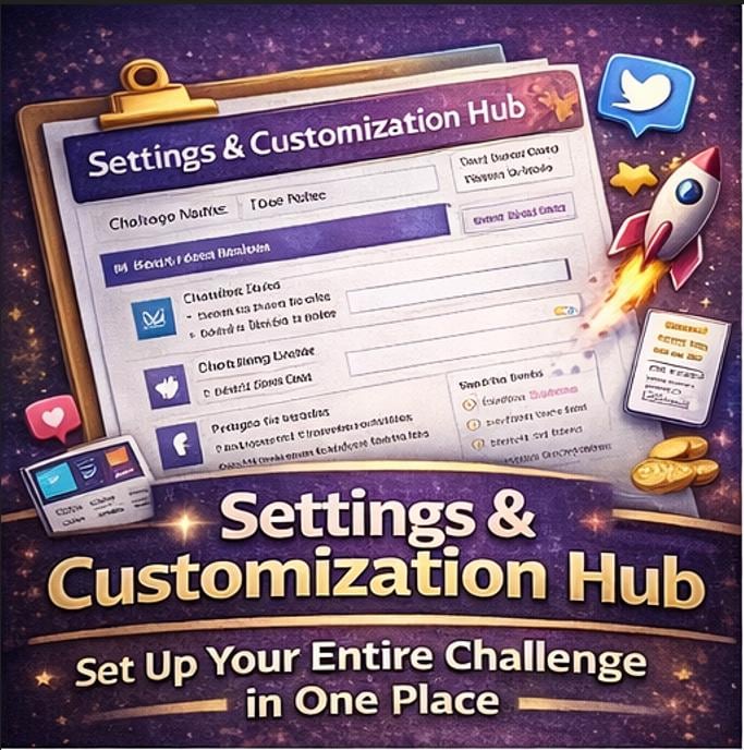 βοΈ Settings & Customization Hub -Set up your entire challenge in one place. Customize your brand name, challenge dates, social media handles, posting schedule, content themes, weekly goals, and your core hashtag list. Reference this page all month long.