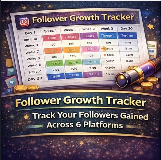 π Follower Growth Tracker -Track your follower count across 6 platforms at every key milestone -Day 1, Week 1, Week 2, Week 3, and Day 30. Watch those numbers climb and celebrate every milestone!