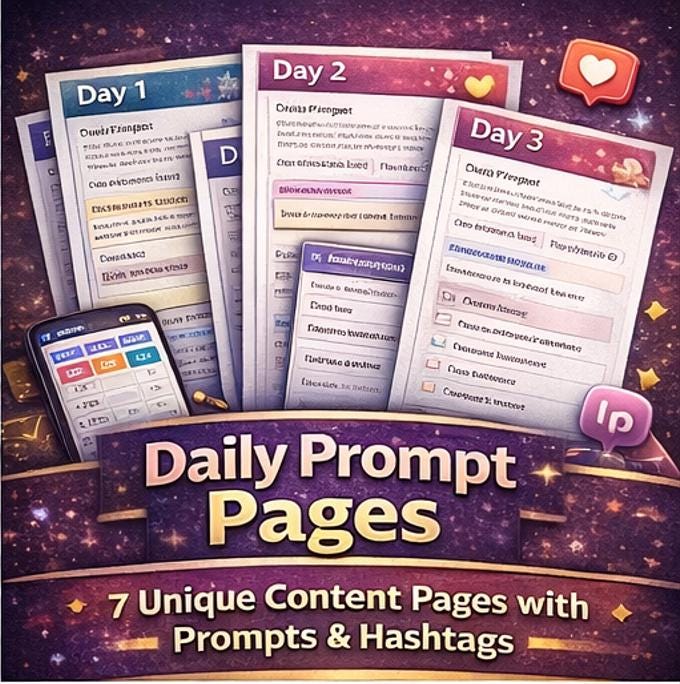 7 Daily Prompt Pages (Days 1β7 Template) -Each daily page is a complete content creation hub featuring a unique theme, a specific posting prompt, a caption starter sentence, hashtag suggestions, platform recommendations, a daily engagement task, a mindset moment, a notes section, and a satisfying completion checkbox. Duplicate these pages to complete all 30 days!