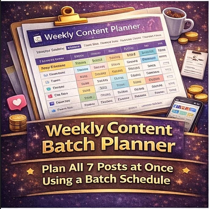 π Sunday Batch Sessions -Use the Weekly Content Batch Planner every Sunday to plan your full week in advance. Creators who batch-create content are 3x more consistent than those who post day-by-day.
