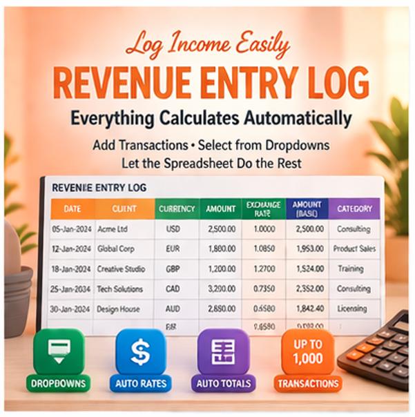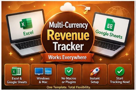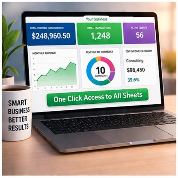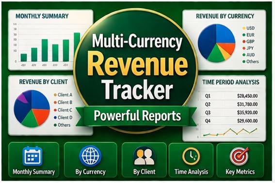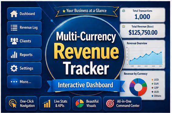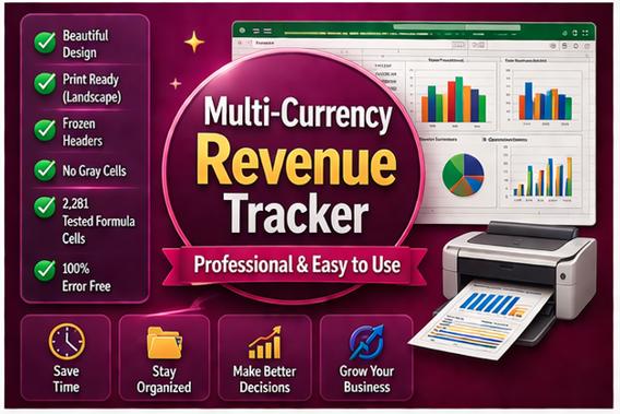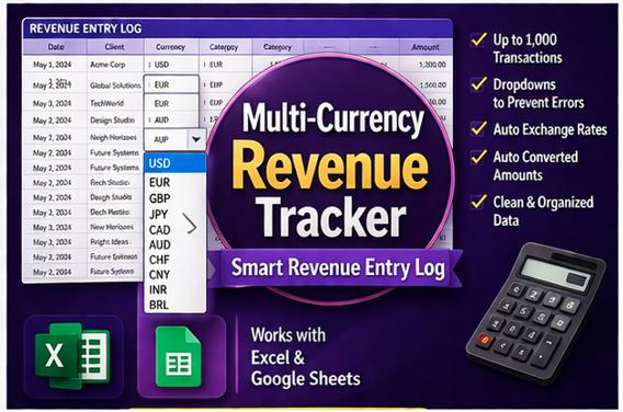 Are you a freelancer, consultant, agency owner, or small business earning income in multiple currencies? Stop struggling with messy spreadsheets and confusing exchange rate calculations. This beautifully designed, ready-to-use revenue tracker does all the heavy lifting for you!