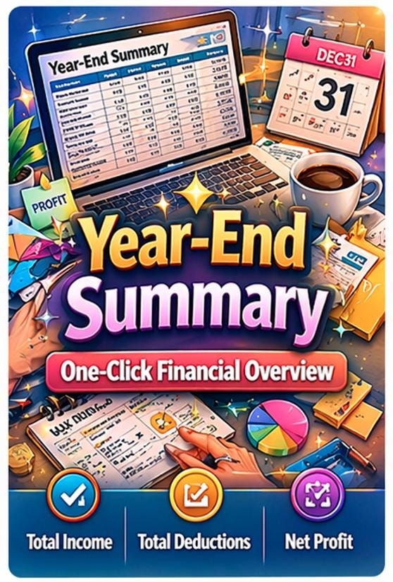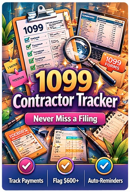 π How to open the template in Excel or Google Sheets π Step-by-step Settings configuration π How to log your first income entry π How to track expenses with auto-categorization π How the contractor 1099 flag works π Quarterly tax payment walkthrough with IRS payment instructions π Year-end filing checklist π 20 tax terms defined in plain English π Troubleshooting FAQ covering 14 common questions π Weekly, quarterly, and annual workflow rituals π Pro tips for working with a CPA