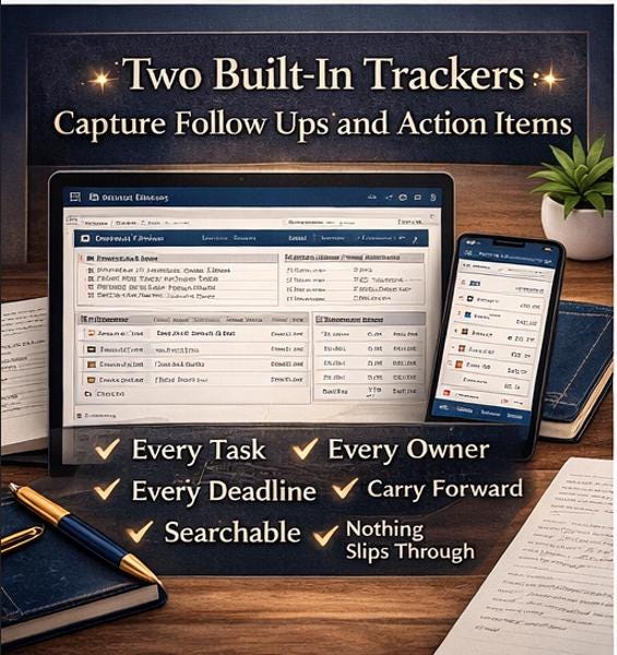 β¨ Premium, cohesive design in a navy, gold, and cream palette β¨ Clean, uncluttered layout that feels calm to work in β¨ Every field placed intentionally for real meeting workflows β¨ Reusable templates you can duplicate endlessly β¨ Two trackers that catch everything that would otherwise slip through the cracks β¨ Clear archive system so nothing is ever lost and nothing clutters the present β¨ 25 page beginner guide means you are never stuck
