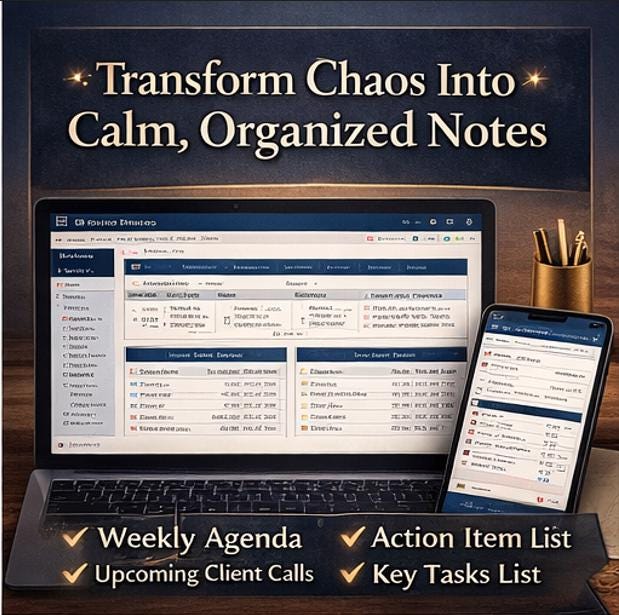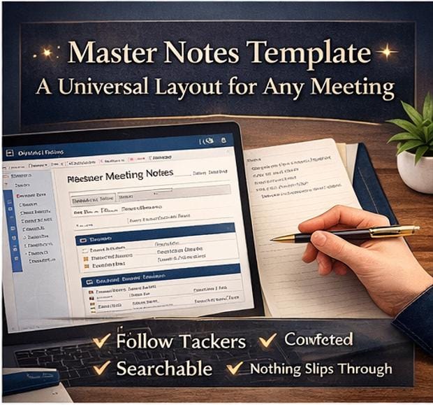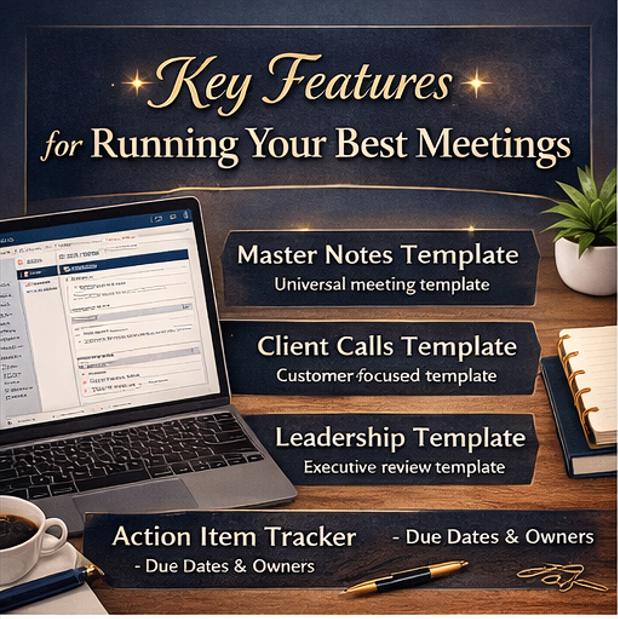 πΈ 01 Welcome : Introduction and notebook philosophy πΈ 02 Instructions : Setup guide and status legend πΈ 03 Meeting Dashboard : Your weekly command center πΈ 04 Master Meeting Notes : Universal template for any meeting πΈ 05 Client Calls : Specialized for external client conversations πΈ 06 Leadership Meetings : Strategic and executive reviews πΈ 07 Internal Syncs : Team stand ups and working sessions πΈ 08 Recurring Meetings : Ongoing meetings with carry forward items πΈ 09 Follow Up Tracker : External commitments and awaiting reply items πΈ 10 Action Item Tracker : Every task, every owner, every deadline πΈ 11 Completed Meetings : Staging area for closed notes πΈ 12 Archive : Year, quarter, and month structure