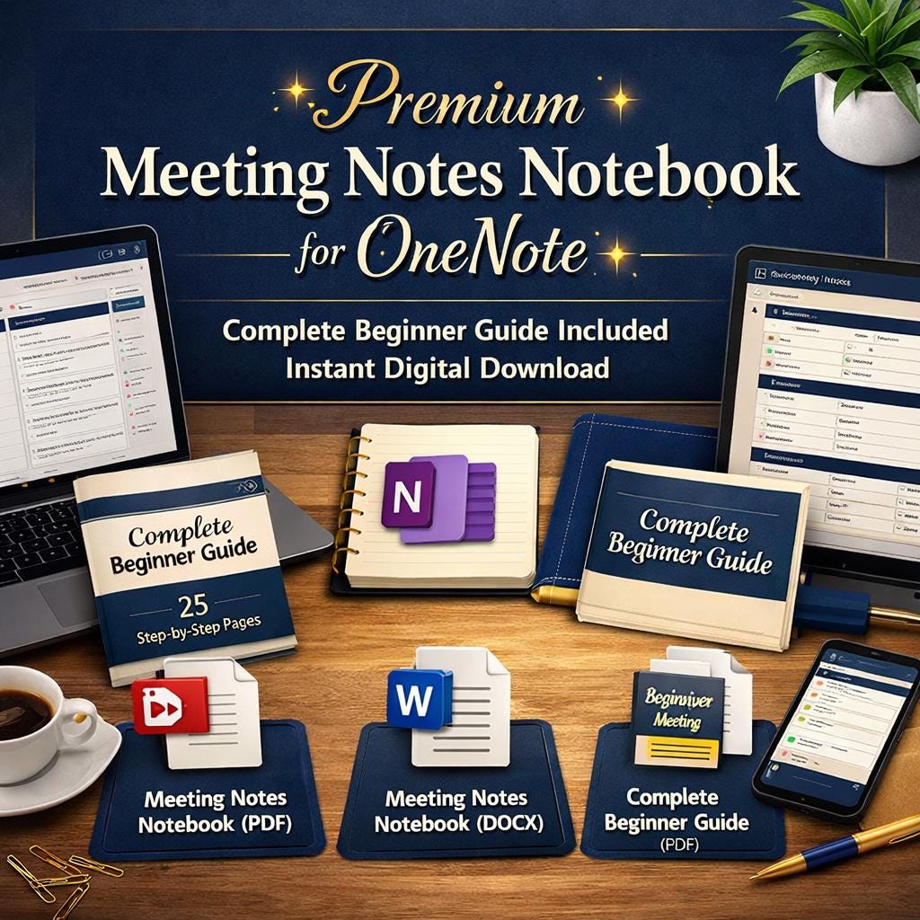 Most meeting templates are one page and leave you guessing. This is a complete system: 12 organized sections, 4 specialized meeting templates, 2 built-in trackers, a weekly dashboard, a clean archive structure, and a full 25 page beginner guide that teaches you how to use it all, even if you have never opened OneNote before.