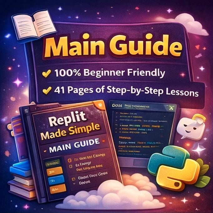๐ File 1: Replit Made Simple โ The Main Guide (41 Pages) ๐ File 2: Replit Quick Cheat Sheet (2 Pages) ๐ File 3: Practice Workbook with 10 Exercises (10 Pages) ๐ File 4: Bonus Resource Pack (7 Pages)